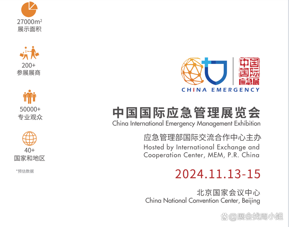 高精尖技术装备汇聚.打造"中国应急展”优质品牌 推动应急产业创新发展的助力器 观察应急产业发展方向的晴雨表 2024中国国际应急管理展览会 展览时间: 2024年11月13日-15日 展会地点:北京国家会议中心(北京市朝阳区天辰东路7号) 展位预定请联系:周霞 136 5178 6569(兼V)