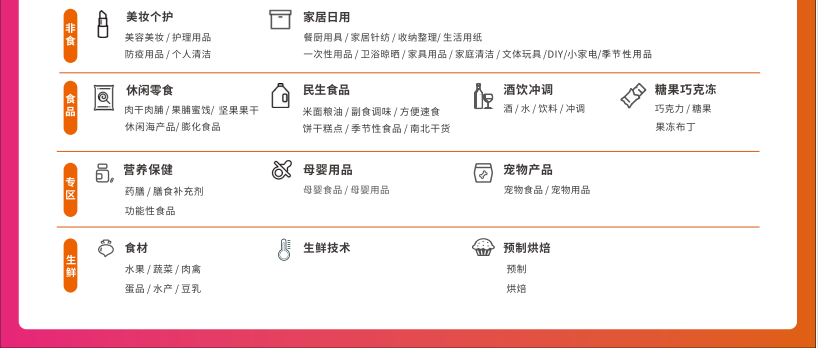 休闲零食、粮油副食、酒水饮料、饼干糕点、糖果巧克力、冲调食品、营养保健品、南北干货。