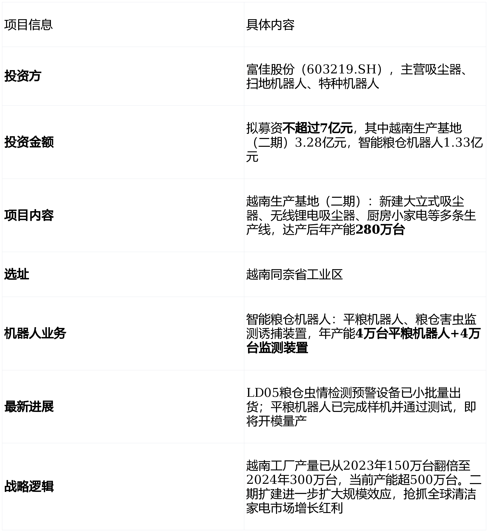 投资信号:这是目前最重资产的布局——直接砸钱建厂,把机器人产能搬去越南。智能粮仓机器人瞄准的是越南农业大国的本地化需求,属于“场景定义产品”的典型。