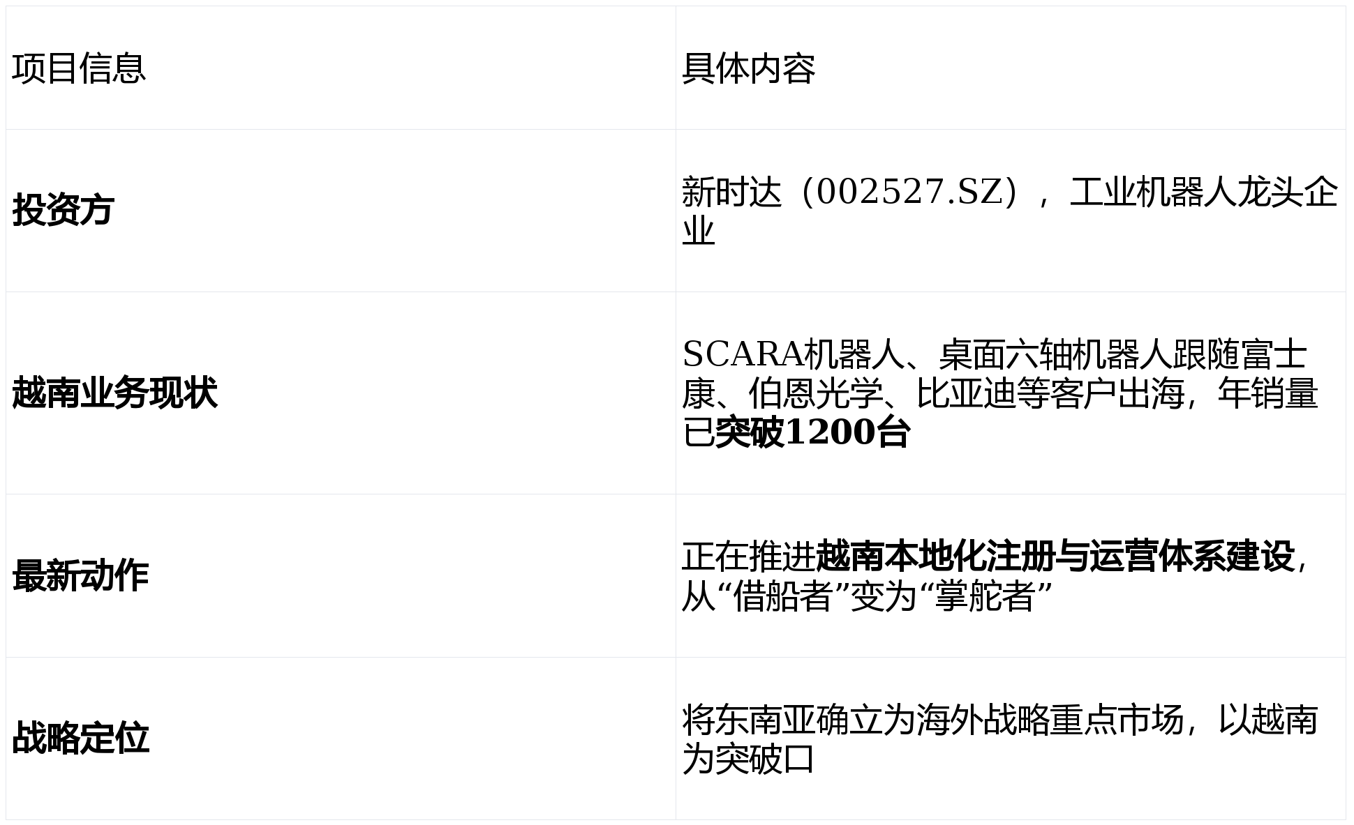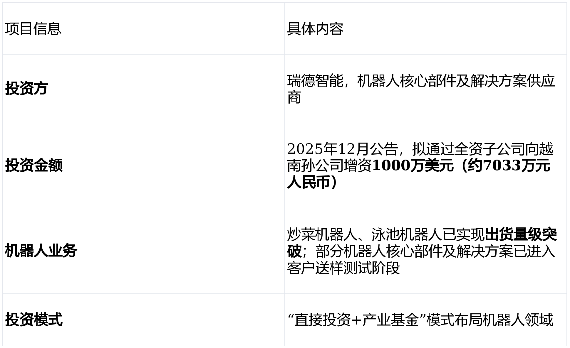 这类不是直接投资越南项目,而是通过资本工具(基金、合资)布局机器人赛道,间接服务越南市场。