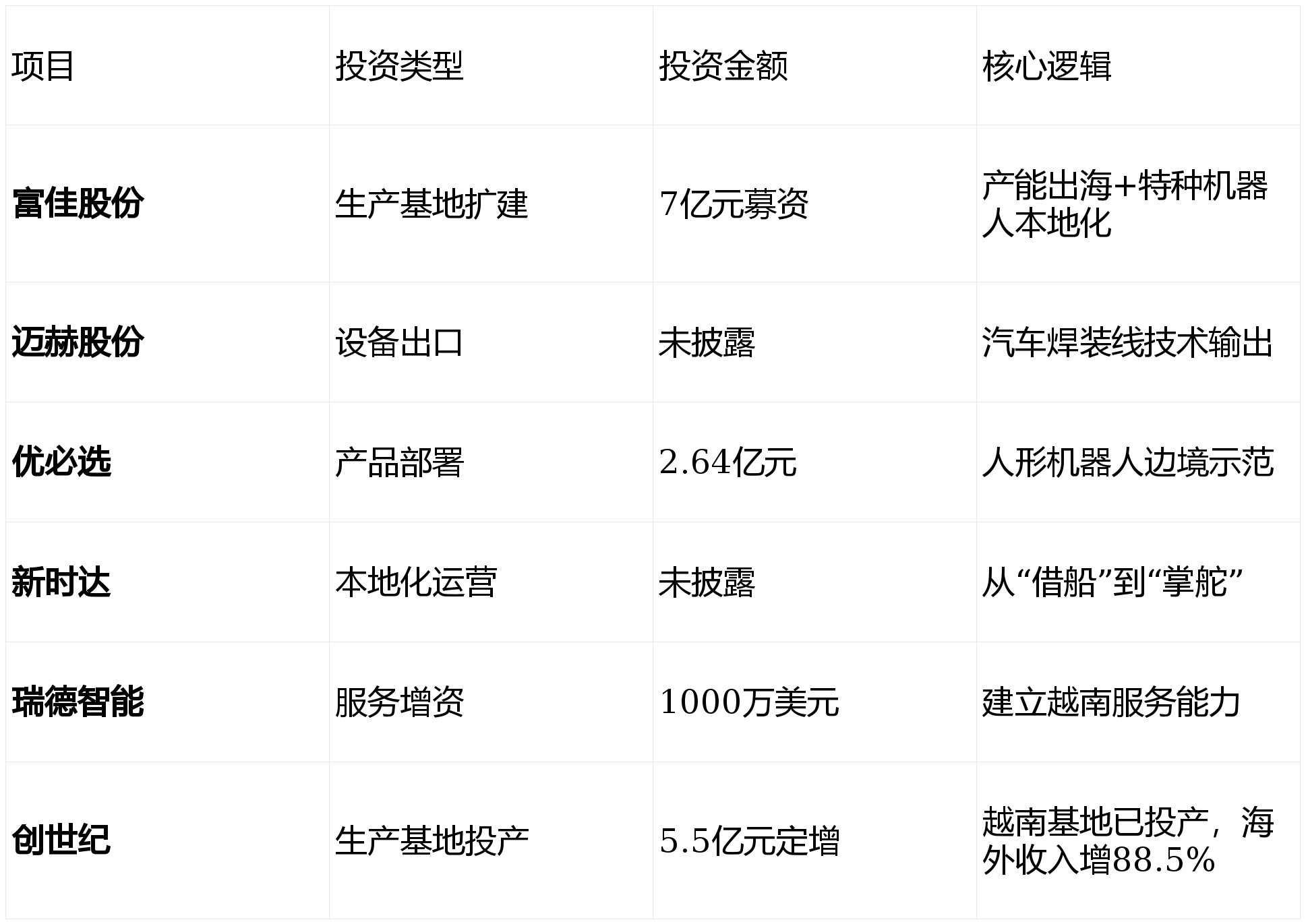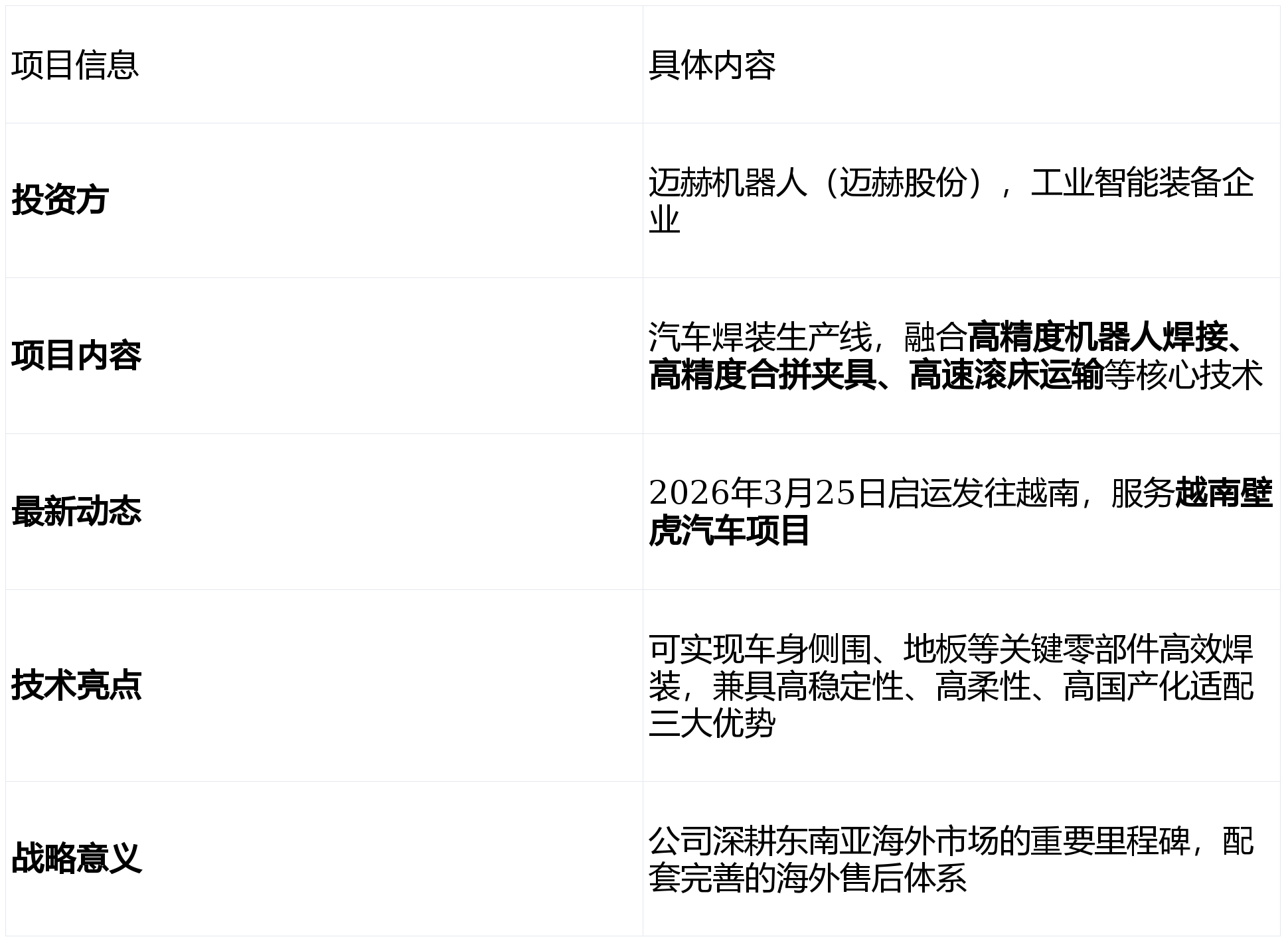 投资信号:这是设备出口+技术服务模式——不建厂,但卖产线、卖技术。越南本土汽车产业(VinFast等)正在扩产,焊装自动化设备缺口巨大。